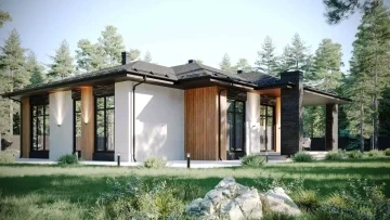 Такая баня может стать не только любимым местом отдыха, но и украшением вашего участка. Это оригинальный проект в современном стиле, с огромной террасой 36 кв.м, просторной и удобной внутренней планировкой: