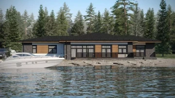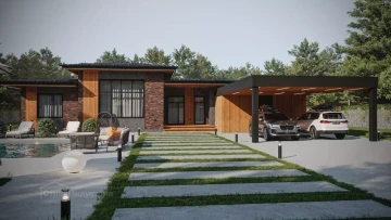 Дом удобной планировки с просторной зоной гостиной-кухни. Есть гардеробная, кабинет и мастерспальня на втором этаже с примыкающей мастерской, гардеробной и собственной ванной комнатой, а также с балконом.